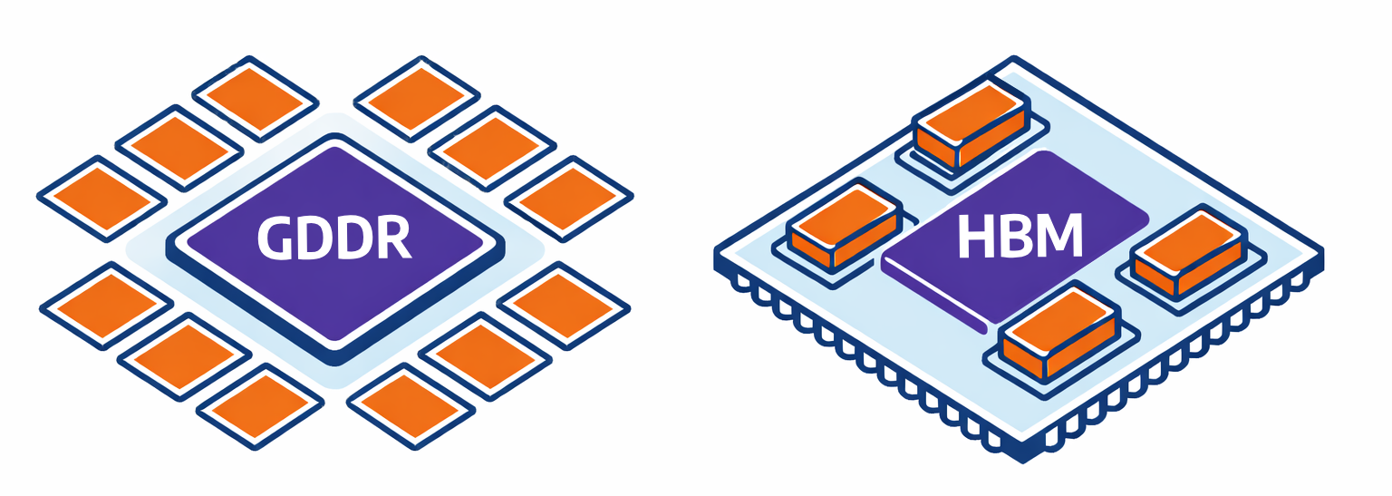 HBM (High-Bandwidth Memory) je typická pre AI GPU. Pamäťové čipy sú tu vrstvené na seba do väčších blokov a prepojené širokou, ale krátkou zbernicou. Vďaka šírke zbernice dosahuje táto pamäť obrovskú priepustnosť (až niekoľko TB/s) a efektivitu pri práci s veľkými objemami dát.
