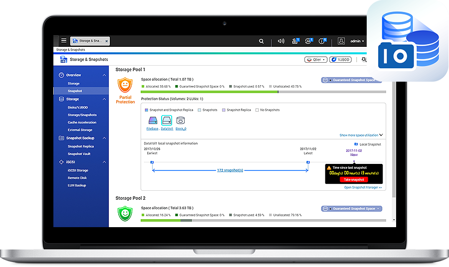 The TS-431XeU supports snapshots, which can record the system status and data at any single moment*. If the system unexpectedly fails or is infected with ransomware, you can instantly restore files from a snapshot. The intuitive snapshot tool in the QTS Storage Manager can be used to take snapshots of your data, and restore data from snapshots if necessary. Always take regular snapshots to ensure the safety of your files and data.