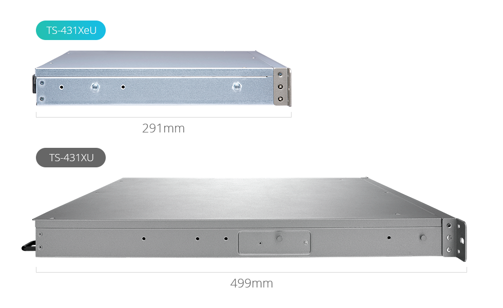 Compared to a traditional 4-bay rackmount NAS, the TS-431XeU has a depth of only 11.46 inches (291 mm). This makes the TS-431XeU an excellent choice for smaller racks, and the unused space can be reserved for cabling or ventilation. The TS-431XeU is space-saving for flexible deployment and is especially suitable for multiple locations and applications including offices, audiovisual rooms and security surveillance recording.